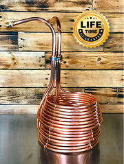 This chiller is faster than most plate chillers and will chill a 5 gallon batch from boiling to 68F in just 3 minutes using only 18 gallons of 58F tap water with three 25' sections of 3/8" outside diameter copper, working in parallel for a total of 75' of copper coil chilling power!